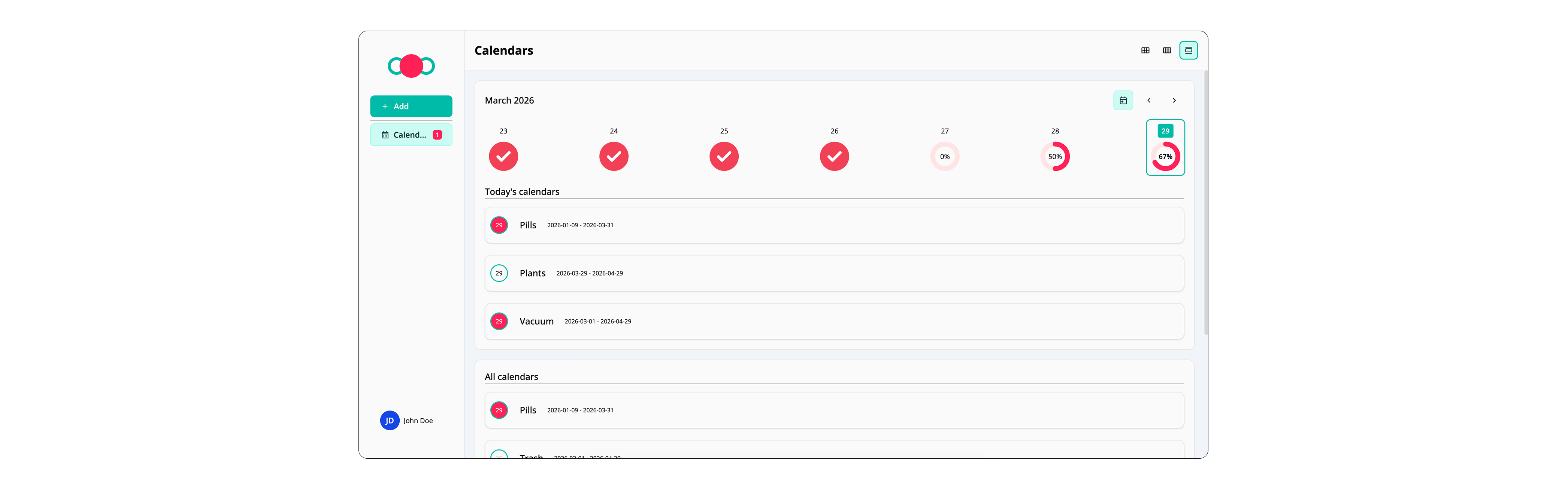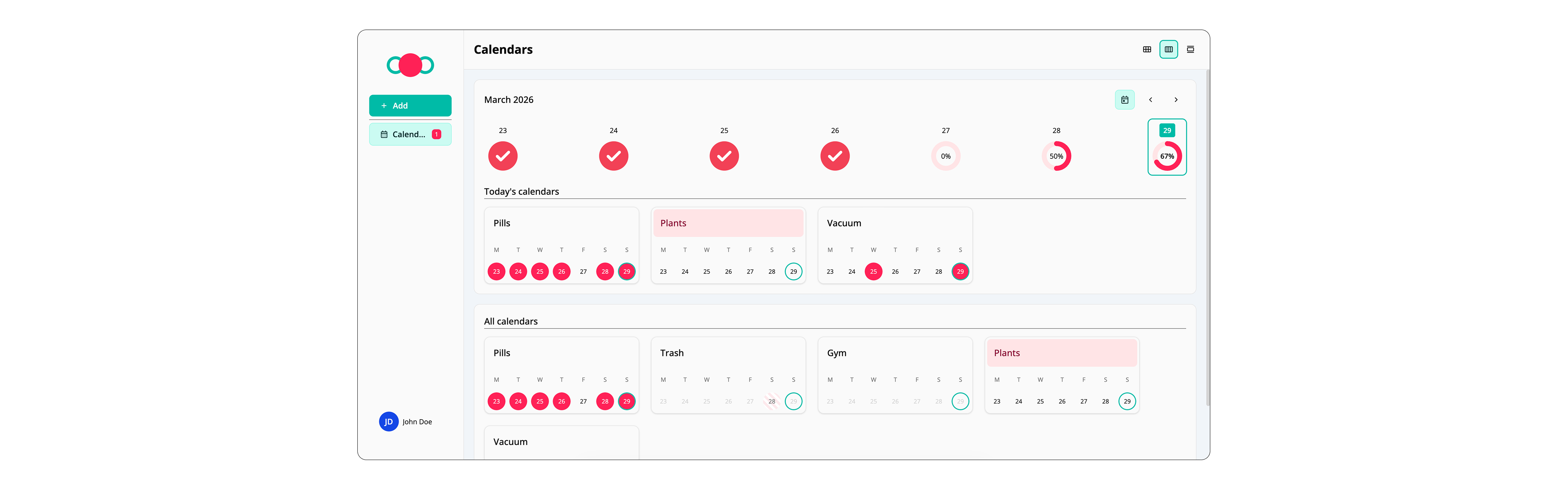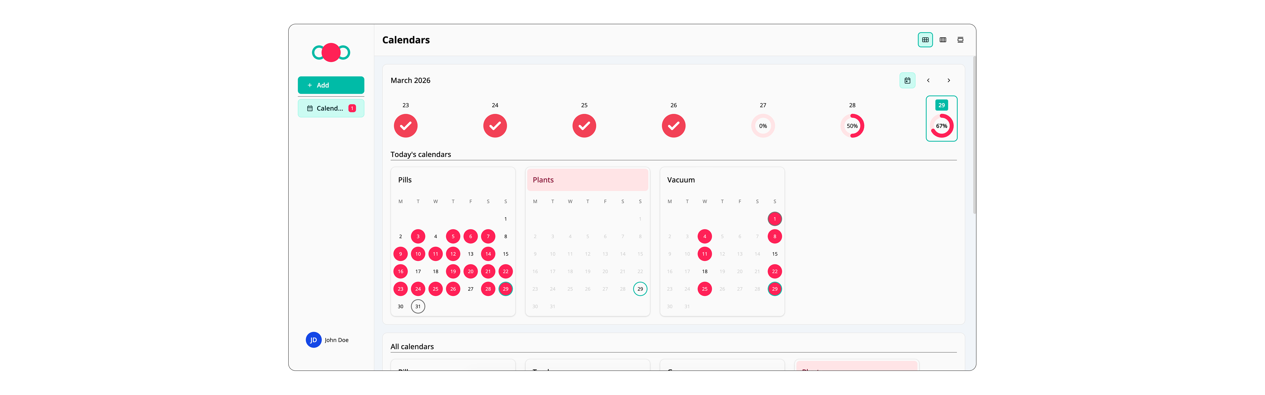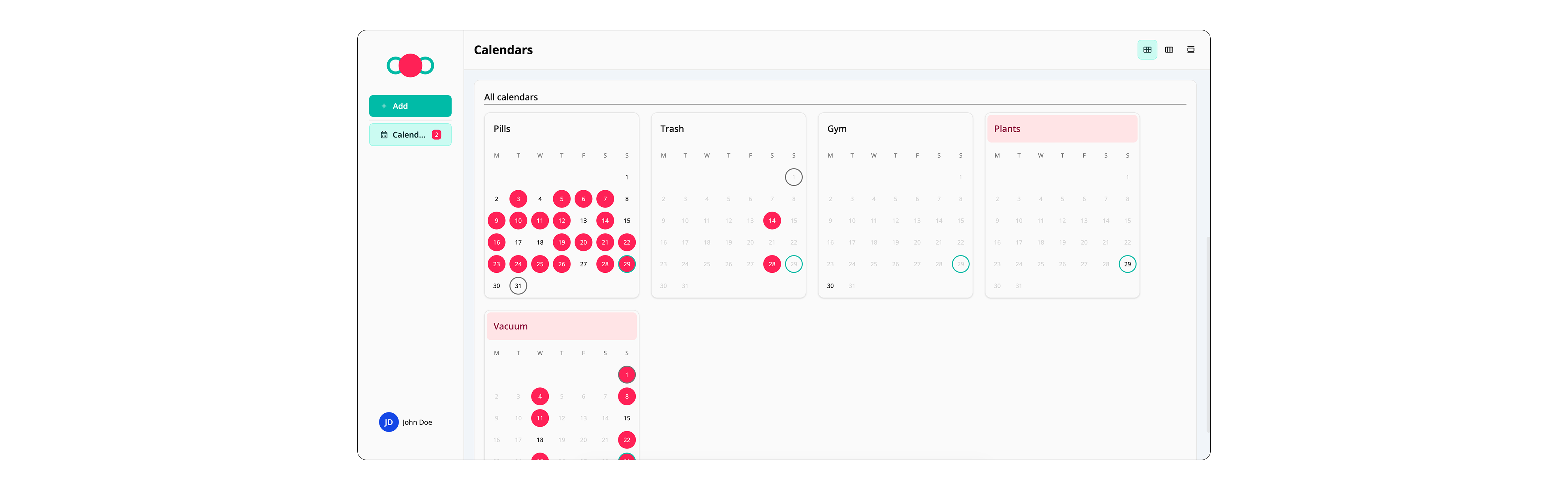 We added an overview page to display all of your calendars and your calendars of the day. You can choose between three different views: "Day view", "Week view", and "Month view".